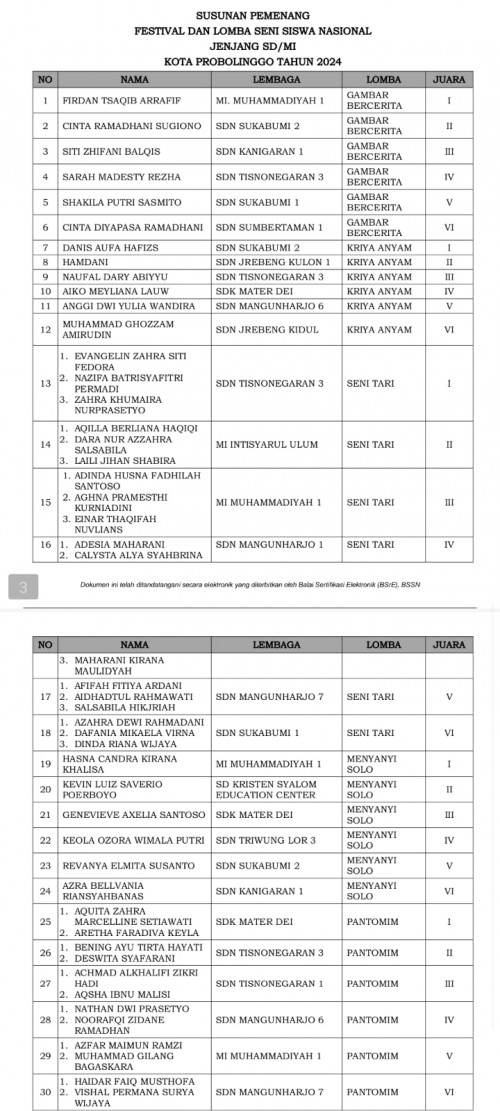 Berdasarkan Surat Keputusan Kepala Dinas Pendidikan dan Kebudayaan Kota Probolinggo Nomor surat 400.3.5.4/1270/425.103/2024 SD Negeri Sukabumi 2 Kota Probolinggo pun berhasil memperoleh kejuaraan sebagai berikut: