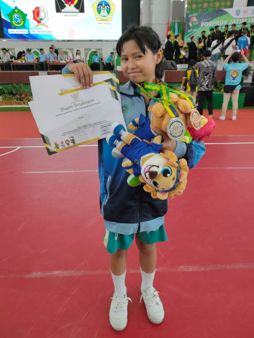 Kota Malang, (Humas) – Siswi SD Negeri Sukabumi 2 Kota Probolinggo Catherine Visha Wardaya, berhasil mengharumkan nama sekolah dengan meraih medali perak Team Double Event dan perunggu Double Event Putri dalam cabang olahraga (cabor) Sepak Takraw pada Pekan Olahraga Provinsi (Porprov) IX Jawa Timur 2025.