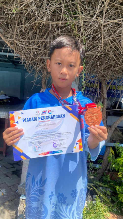 Probolinggo, (Humas) – Alvaro Zian Mahardika, siswa kelas III C SD Negeri Sukabumi 2 Kota Probolinggo, kembali menorehkan prestasi gemilang di ajang Kejuaraan Renang “Speed Challenge Student Aquatic Competition Tahun 2025” yang diselenggarakan oleh Centrum Management Event pada tanggal 5 Oktober 2025 di Kolam Renang Krida Tirta Juanda, Surabaya. Dalam kejuaraan tersebut, Alvaro berhasil meraih medali perunggu pada nomor 50 m gaya kupu-kupu KU 2017 Putra.