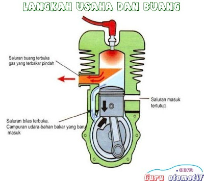 Sementara itu proses kerja di bawah piston, katup buang terbuka, dan saluran bilas juga terbuka, saluran bilas ini adalah saluran untuk menyalurkan campuran bahan bakar dan udara dari bak engkol ke ruang silinder. Dan ketika piston berada pada posisi dimana saluran bilas dan katup buang membuka maka proses pembuangan hasil pembakaran dimulai. Gas baru yang berada di ruang engkol terdesak oleh piston kemudia mengalir melalui saluran bilas menuju ruang silinder sambil membantu mendorong gas hasil pemabakaran ke luar melalui katup buang. Proses ini disebut langkah buang. Silahkan lihat gambar di atas.