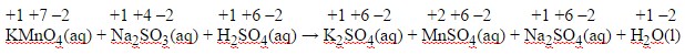 2 KMnO4(aq) + 5 Na2SO3(aq) + 3 H2SO4(aq) → K2SO4(aq) + 2 MnSO4(aq) + 5 Na2SO4(aq) + 3 H2O(l)