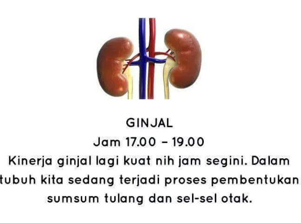 Jam 17:00 -19:00, Ginjal dalam kondisi kuat, terjadi proses pembentukan sumsum tulang dan sel otak. Ini jam terbaik utuk belajar.
