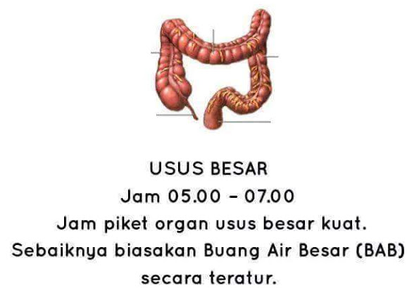Jam 05:00 - 07:00, Usus besar dalam kondisi kuat, biasakan B.A.B di jam ini agar kotoran, racun dan sisa sistem pencernaan dapat dikeluarkan semua.