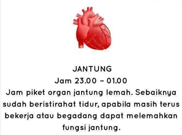 Jam 23:00 - 01:00, Jantung sedang dalam kondisi lemah. Waktunya istirahat untuk pemulihan energi tubuh.