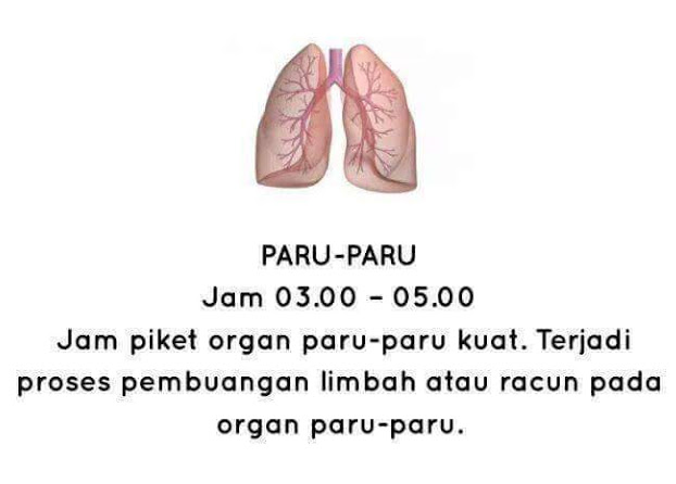 Jam 02.30 - 04:30, Kondisi paru paru sedang kuat, terjadi pembersihan dan pembuangan racun atau kotoran diparu paru. Akan terjadi batuk, bersin dan berkeringat bila paru-paru kotor.