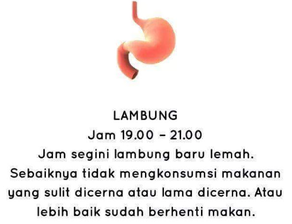 Jam 19:00 - 21:00, Lambung sedang lemah. Diusahakan jangan mengkonsumsi makanan padat yang sulit dicerna, atau lebih baik berhenti makan.
