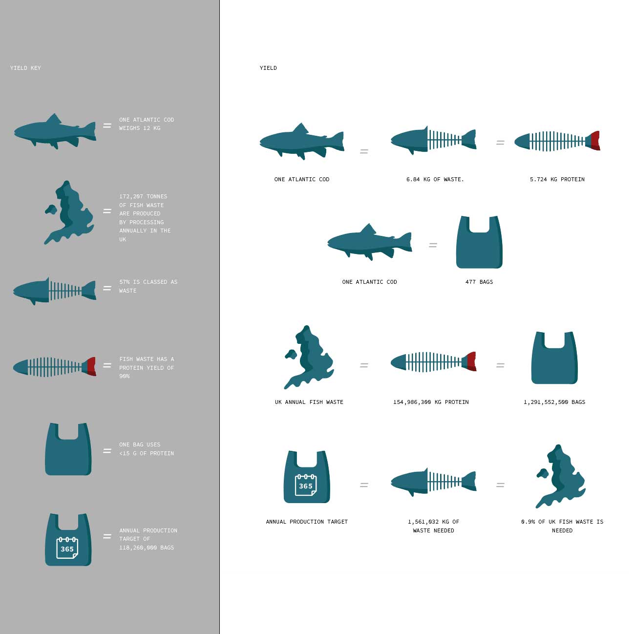 Dimulai di pabrik pengolahan dan pedagang ikan lokal, kemudian aliran limbah diidentifikasi, bervariasi dari jeroan, darah, krustasea, kerang dan kulit, hingga sisik ikan. Dari limbah-limbah yang berbeda ini diteliti setiap komposisi dan potensi setiap limbah. Setelah diteliti, ditemukan bahwa kulit dan sisik ikan memiliki potensi didalamnya karena memiliki fleksibelitas yang memungkinkan untuk digunakan sebagai plastik. Dengan memanfaatkan sumber daya open source, Lucy mulai bereksperimen dengan berbagai pengikat organik dari laut. Dalam proses ini membutuhkan 100 percobaan berbeda untuk menyempurnakan dan mendapatkan hasil yang konstan dan seperti plastik.