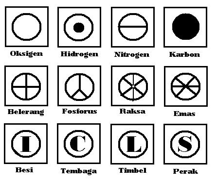 Setelah itu, John Dalton mencoba menyederhanakan lambang unsur-unsur tersebut dengan menggunakan dasar lingkaran. Di dalam lingkaran tersebut ditulis lambang khusus untuk setiap unsur. Berikut lambang-lambang unsur hasil ciptaan daru John Dalton.