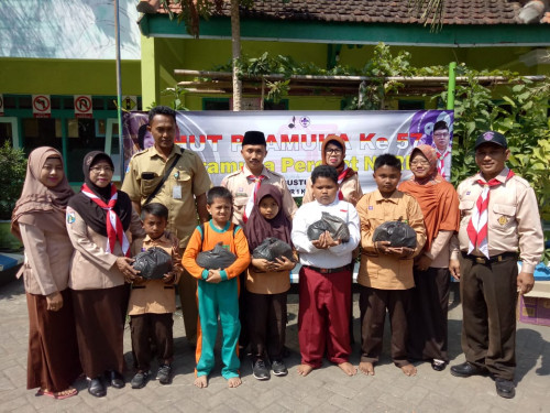Memperingati hari pramuka yang ke-52 SDN Jrebeng Lor 1 mengisi acara dengan membagikan bingkisan kepada beberap siswa yang kurang mampu.