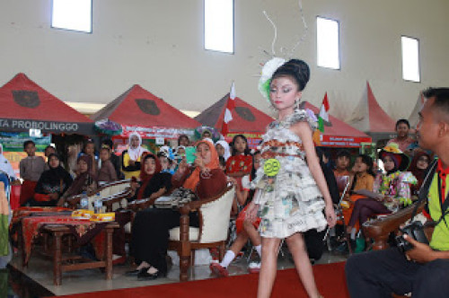 Betapa angunnya siswi ini mengenakan baju yang dibuat dari bahan daur ulang. Dalam rangka mengikuti lomba Fashion Daur Ulang