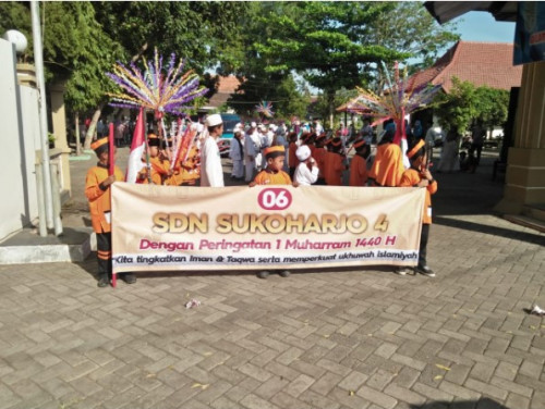 Memperingati Tahun Baru Islam 1 Muharram, SDN Sukoharjo 4 turut berpartisipasi dalam memeriahkan gelaran pawai yang diadakan khusus untuk SD se-kecamatan Kanigaran Kota Probolinggo.