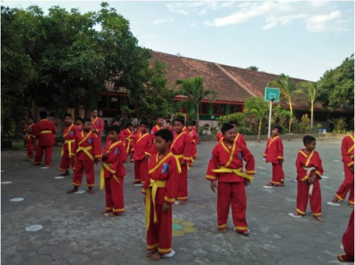 Para siswa SDN Sukoharjo 4 mengikuti ekstra pencak silat dengan penuh kegembiraan.