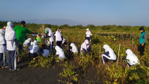 Penanaman mangrove telah menjadi agenda tahunan yang dilakukan warga SMPN 9 Probolinggo. Penanaman mangrove menjadi salah satu bentuk kepedulian SMPN 9 terhadap kelangsungan biota laut sekaligus penangkal erosi, loh! Kali ini kegiatan penanaman mangrove dilakukan pada hari Selasa, 28 September 2021 di Pantai Permata, Kelurahan Pilang, Kota Probolinggo. Kegiatan ini diikuti 60 warga SMPN 9 yang terdiri dari 20 orang guru dan karyawan serta 40 siswa. Penanaman mangrove dimulai pukul 06.00 WIB-08.00 WIB. Meski kegiatan ini hanya berlangsung dua jam, tetapi dampaknya sangatlah besar! Salah satunya, menjaga kualitas air laut dan mencegah erosi pantai.