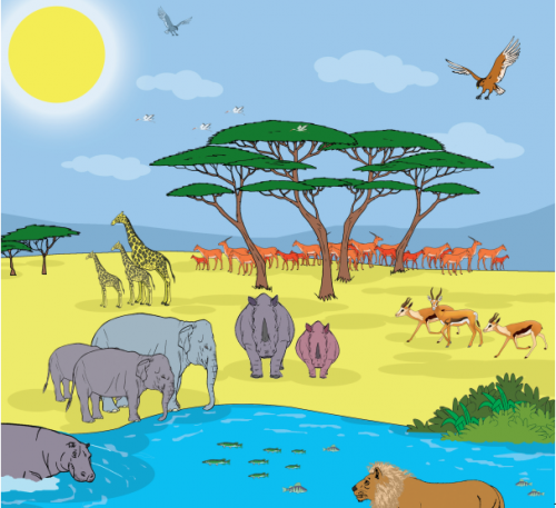 Ekosistem sabana memiliki curah hujan yang lebih rendah daripada ekosistem hutan hujan tropis. Hewan-hewan yang hidup di sabana antara lain berbagai jenis serangga dan mamalia seperti zebra dan singa.