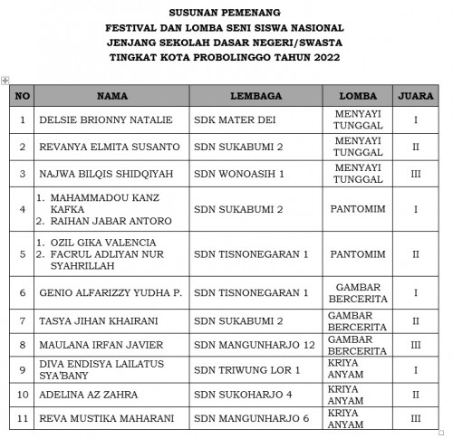 “Nantinya mereka yang juara dalam lomba ini akan ikut dalam pertandingan tingkat provinsi hingga nasional. Ini masih tingkat Kota Probolinggo,” tuturnya.