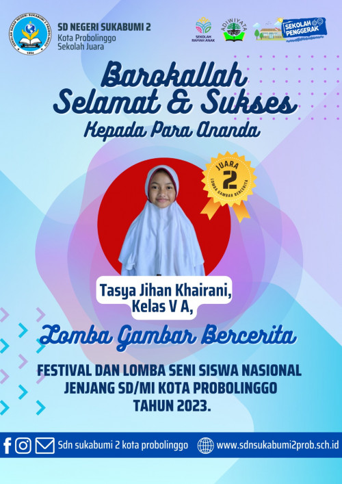Tasya Jihan Khairani, siswi multi talenta kelas V A berhasil menyabet juara 2 cabang lomba gambar bercerita. Atas raihannya ini, Jihan berhak lanjut ke jenjang provinsi pada musim festival bergengsi gelaran Kemdikbud tahun ini. "Talenta menggambarnya memang oke, kreativitasnya juga totalitas. Dengan sedikit sentuhan saja, dia sudah bisa mengembangkan ide dan mengelola menata seluruh aspek visual," urai Yustianingsih, guru pendamping Jihan.